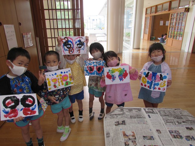 ゆき組『デカルコマニー』画用紙の半分に丸、三角、ギザギザなどを描き、広げると色が混ざり合って左右対称の絵の出来上がりです。