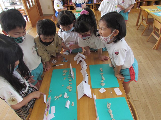 つき組『粘土で遊ぼう』グループで何を作るか相談しました。「あれがいい」「これがいい」となかなかまとまらずに意見が分かれていたグループもありましたが、お互いの意見を取り入れる案に落ち着き、納得して活動が進められました。「パン屋さん」「お菓子屋さん」「果物屋さん」「ケーキ屋さん」「動物園」にテーマが決まり、黙々と粘土と向き合う子どもたちでした。
