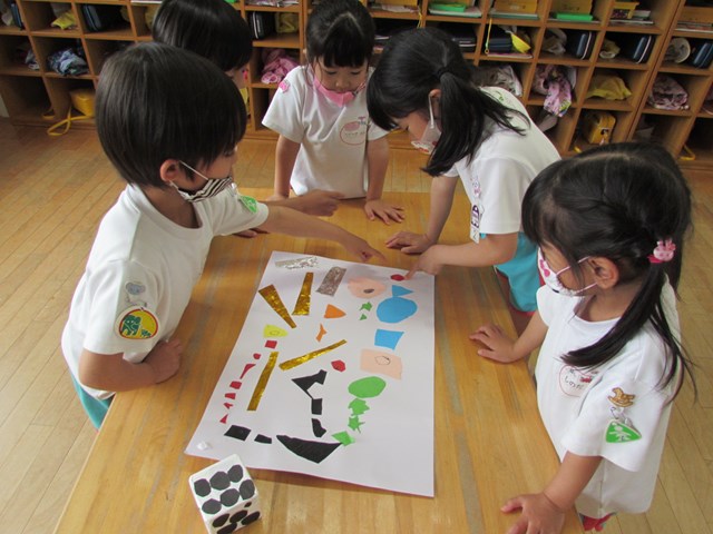 ほし組『すごろくを作ろう』最近、言葉の文字数で進むすごろくゲームがお気に入りで、グループで話し合い、言葉を見つける楽しさやみんなでゴールを目指すことの喜びを感じている子どもたち。