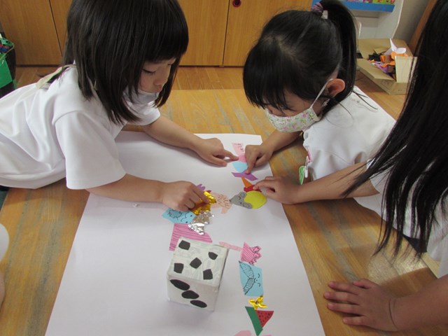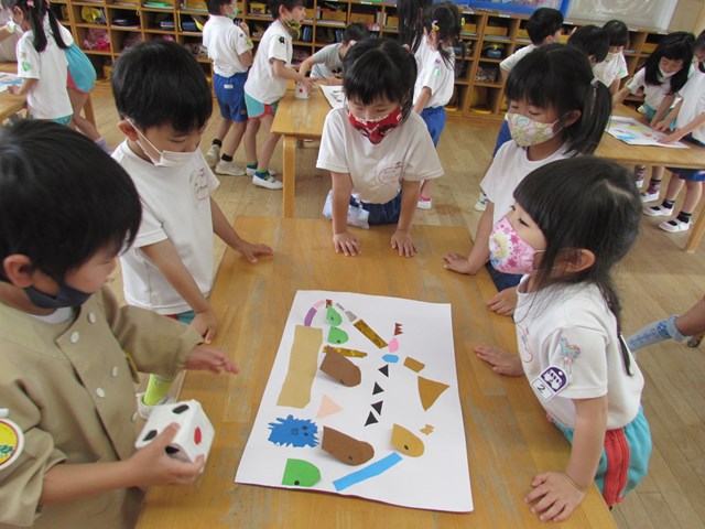 各クラスそれぞれに造形遊びを楽しみました。発見があったり、友達と話し合ったり、自分たちで遊びを進めていったりと、年長児らしい活動が繰り広げられました。
