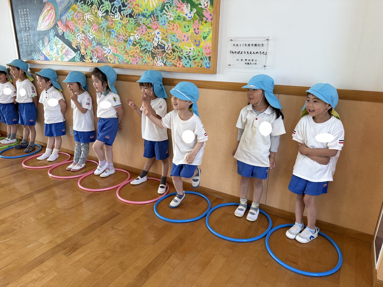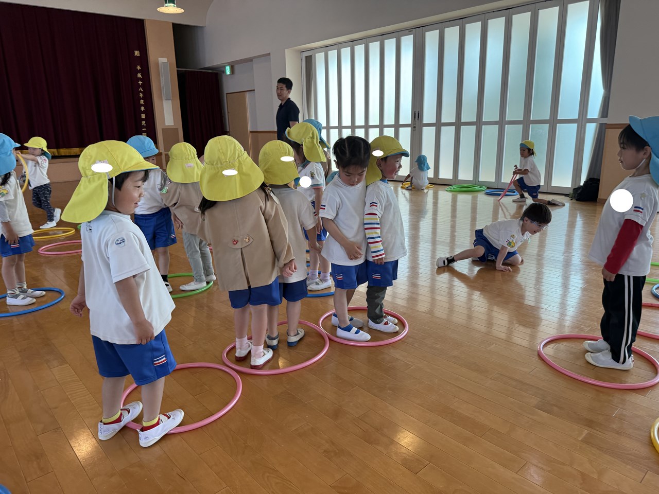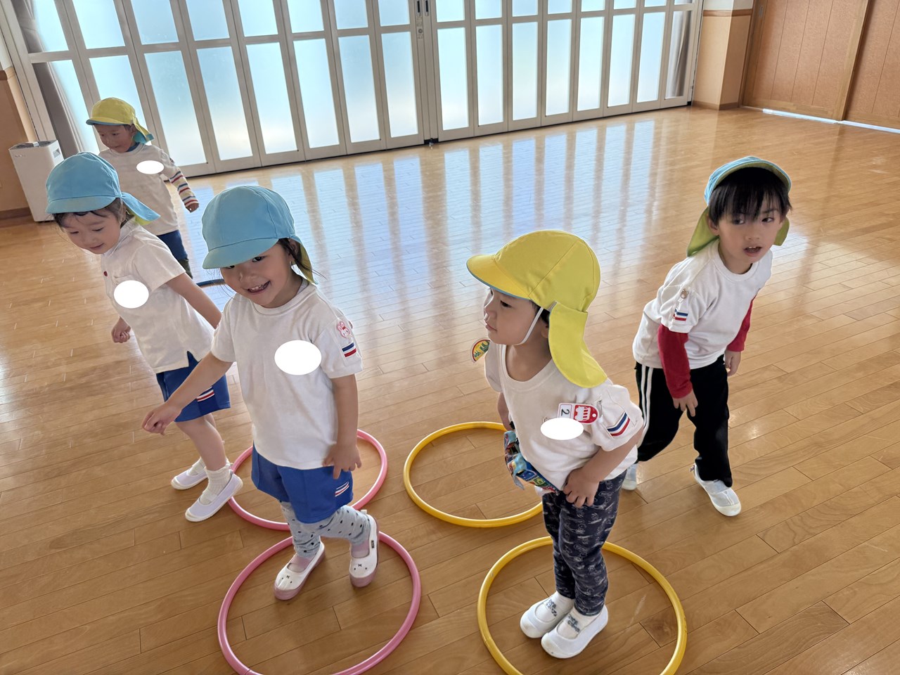 まずは、みんなで元気よく体操をします。先生の真似っこをしながら、ジャンプをしたり、片足立ちをしたり…。その後は、一人一つフラフープを持って、お引越しゲームの始まりです。先生の「お引越し」の掛け声で、自分のフラフープから、他のお友だちのフラフープへお引越し。お引越しをしている間に先生につかまらないように、急いで移動します。お引越しゲームが終わると、フラフープを使ってジャンプをしたり、腕を使ってクルクルと回してみたり、道を作ったり、フラフープ一つでも工夫次第でたくさんの遊びに変身!!