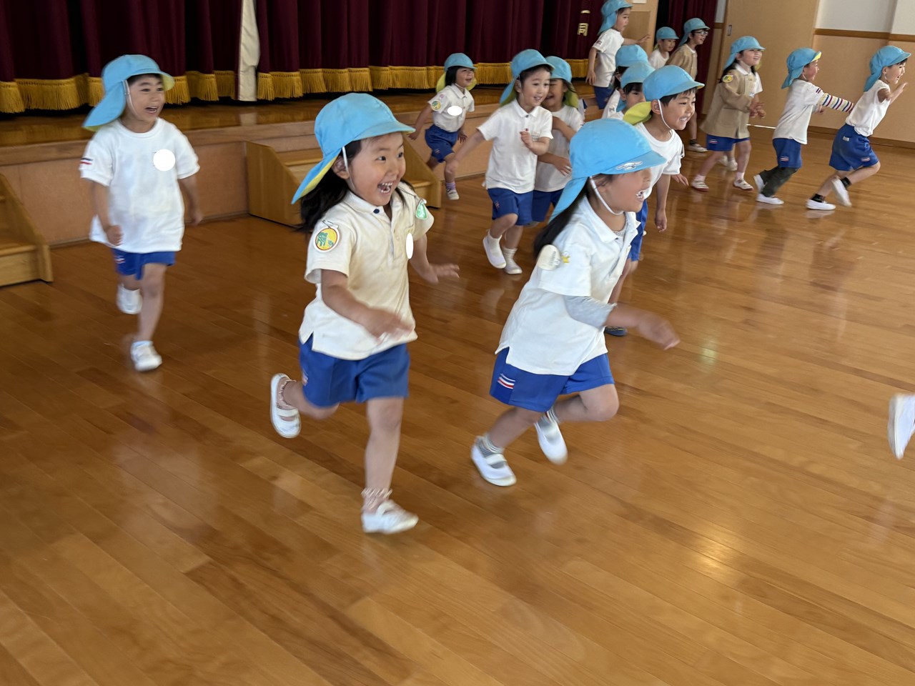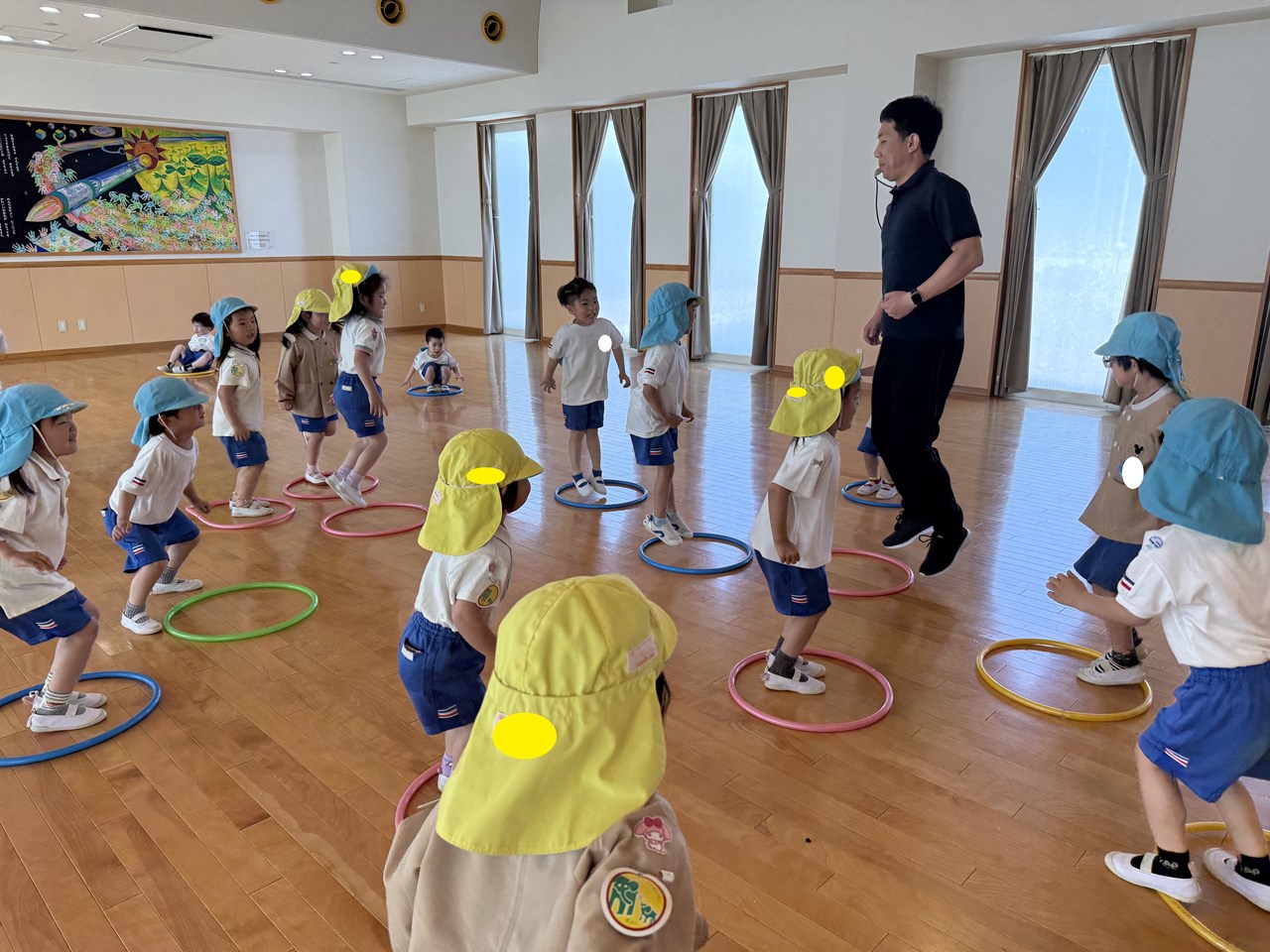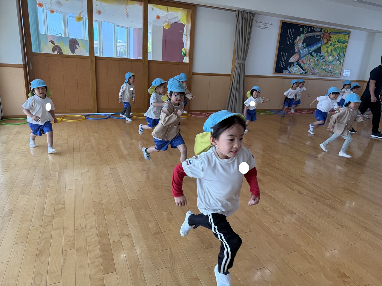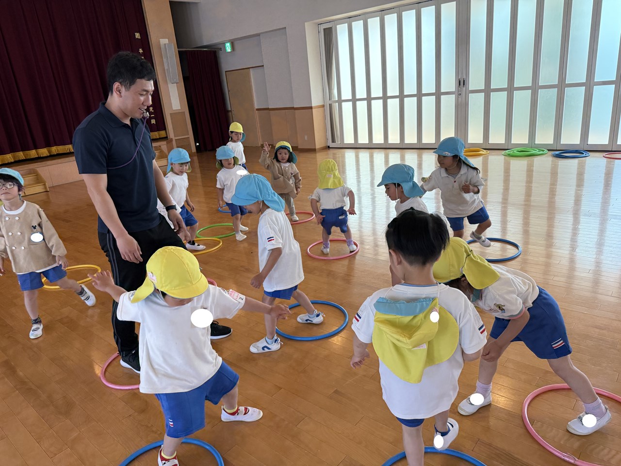 まずは、みんなで元気よく体操をします。先生の真似っこをしながら、ジャンプをしたり、片足立ちをしたり…。その後は、一人一つフラフープを持って、お引越しゲームの始まりです。先生の「お引越し」の掛け声で、自分のフラフープから、他のお友だちのフラフープへお引越し。お引越しをしている間に先生につかまらないように、急いで移動します。お引越しゲームが終わると、フラフープを使ってジャンプをしたり、腕を使ってクルクルと回してみたり、道を作ったり、フラフープ一つでも工夫次第でたくさんの遊びに変身!!